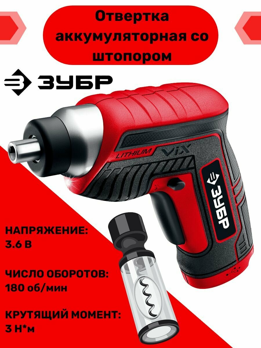 ЗУБР ViX 3.6 В, аккумуляторная отвертка, 10 бит, насадка штопор (ЗО-Е-3.6 ЛиМ1)