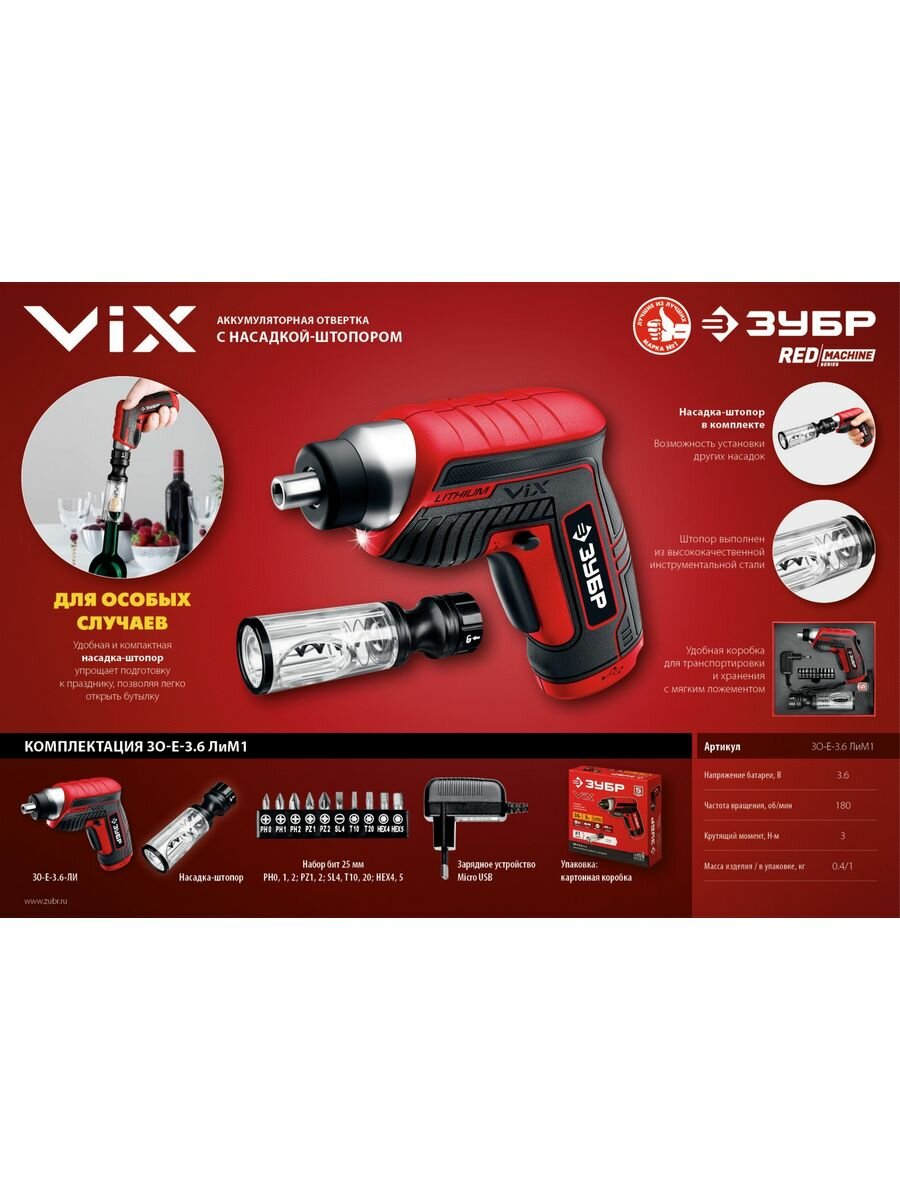 Отвертка аккумуляторная ViX со штопором ЗУБР ЗО-Е-3.6 ЛиМ1