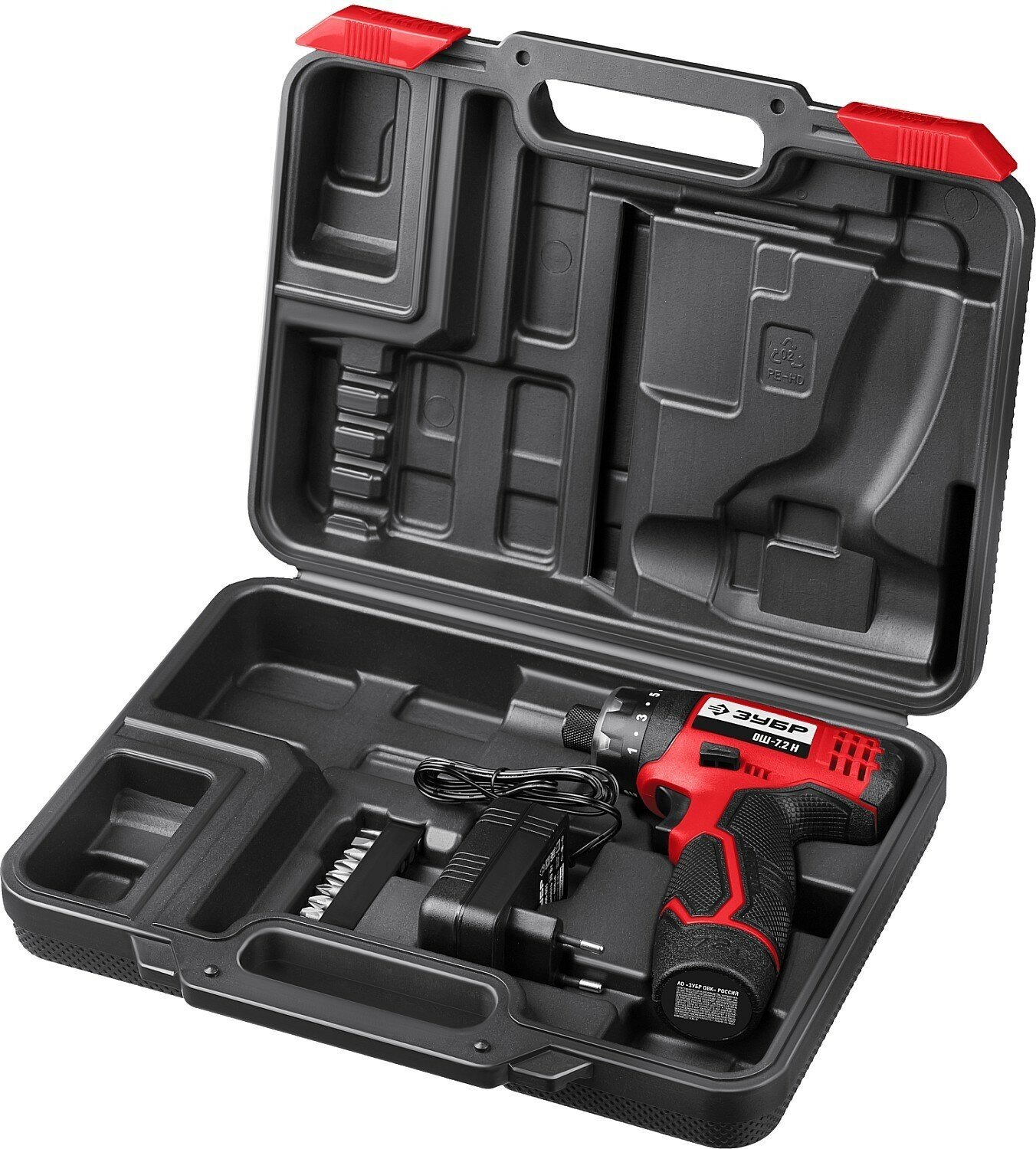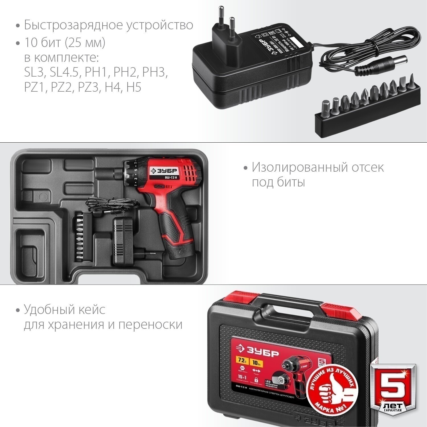 ЗУБР ОШ-7.2 Н отвертка-шуруповерт аккумуляторная 7.2 В, в кейсе с 10 битами