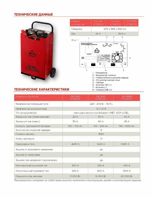 ARNEZI R7990211 Зарядно-пусковое устройство CD-520 (12/24В, 20-30А, акб 120-750Ач, пуск 520А)