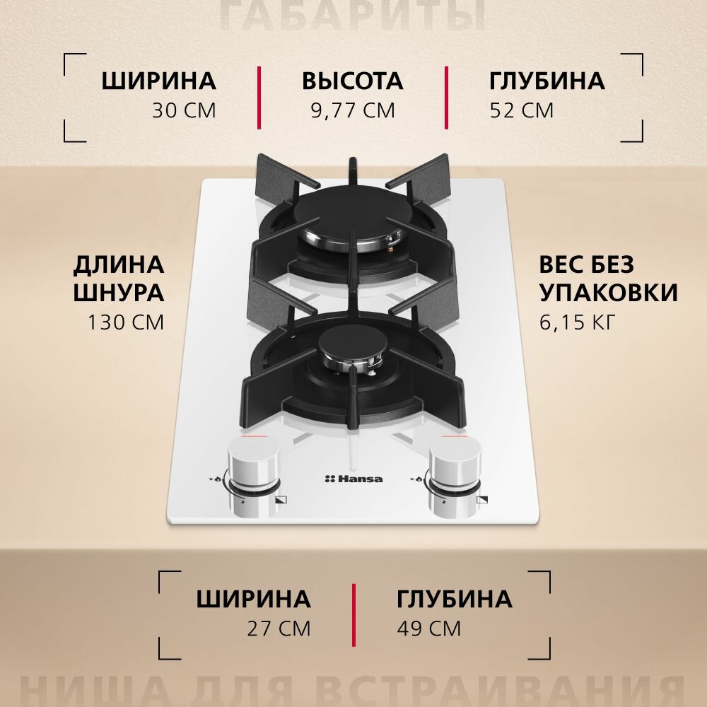Газовая варочная панель Hansa BHKW330500, двухконфорочная, стеклянная поверхность, с газ-контролем и автоподжигом, белая