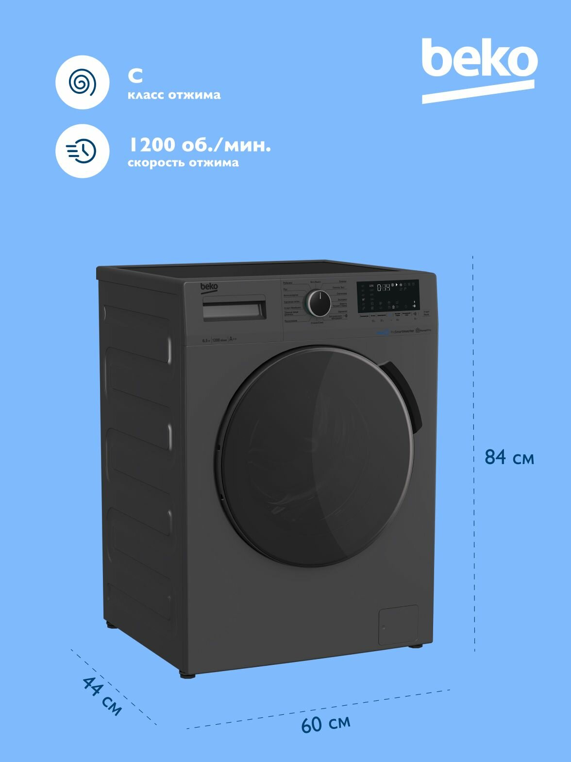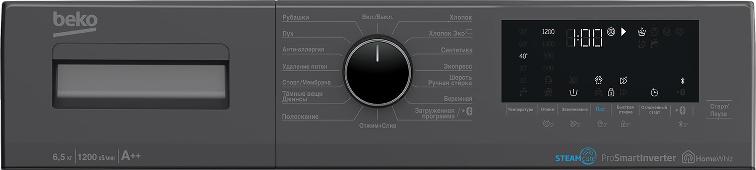 Стиральная машина Beko WSPE6H616S, инверторная, загрузка 6.5 кг, 1200 об/мин, серый