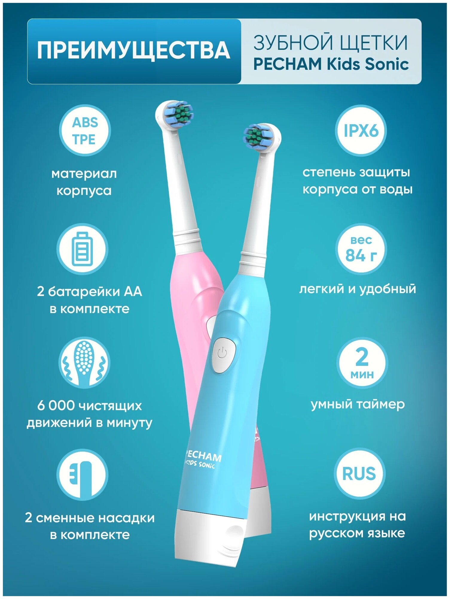 Детская электрическая зубная щетка PECHAM Kids Sonic Blue 5+, 2 насадки, 2 батарейки АА интересное:
