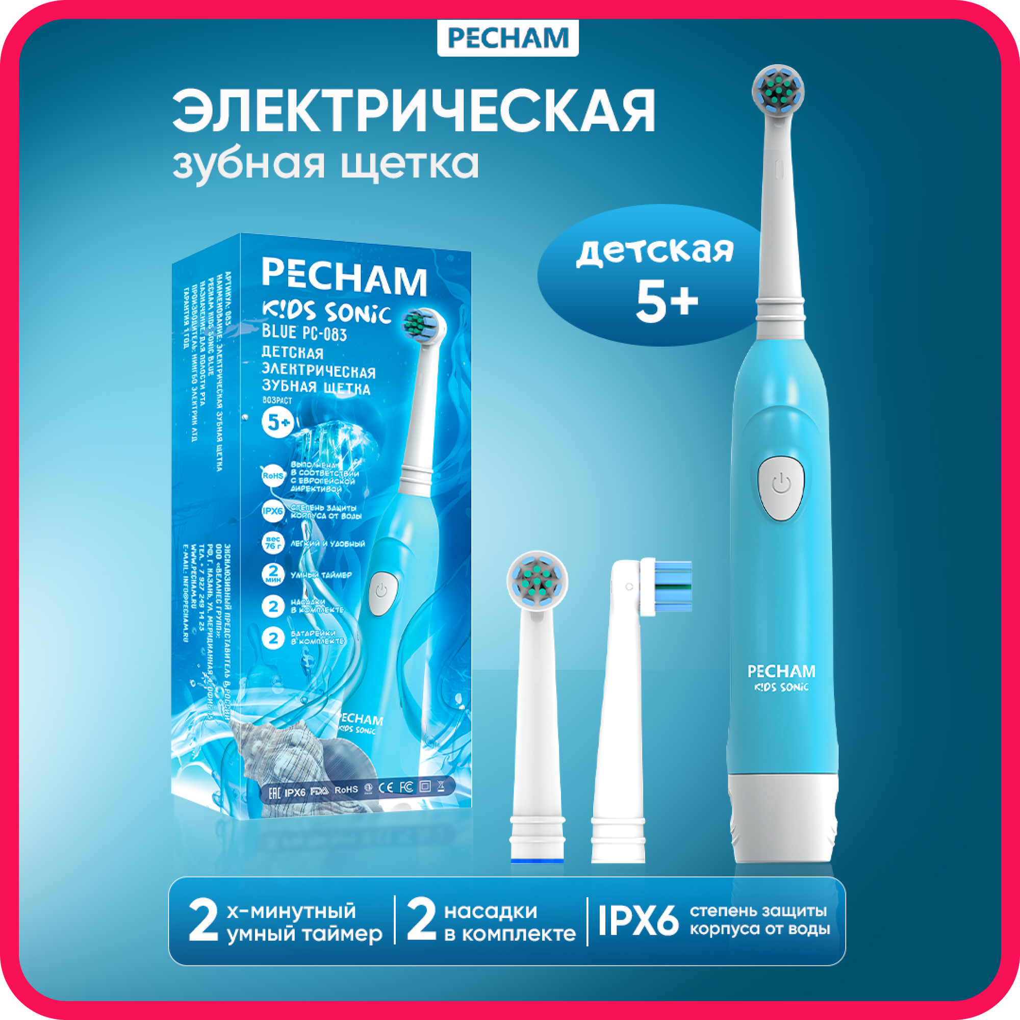 Купить Детская электрическая зубная щетка PECHAM Kids Sonic Blue 5+, 2 насадки, 2 батарейки АА