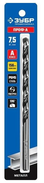 ЗУБР ПРОФ-а, 7,5 х 156 мм, сталь Р6М5, класс А, удлиненное сверло по металлу, Профессионал (29624-7.5)