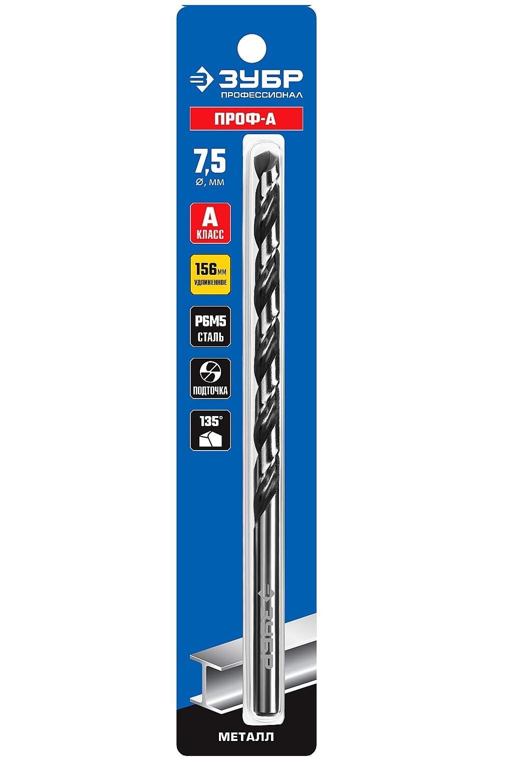 ЗУБР ПРОФ-а, 7,5 х 156 мм, сталь Р6М5, класс А, удлиненное сверло по металлу, Профессионал (29624-7.5)