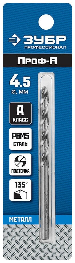 ЗУБР ПРОФ-а 4.5х80мм, Сверло по металлу, сталь Р6М5, класс А, 29625-4.5, Серия Профессионал