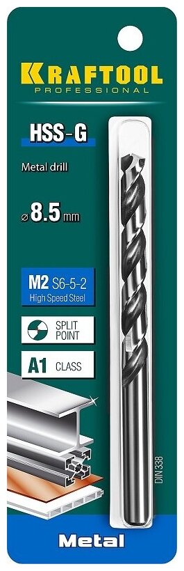 Купить KRAFTOOL Сверло по металлу, HSS-G, класс A, DIN 338, d=8.5 мм, сталь М2(S6-5-2), KRAFTOOL