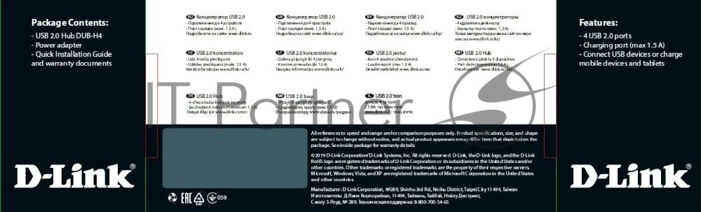 Концентратор usb D-Link DUB-H4/E1A, 4-port USB 2.0 Hub.4 downstream USB type A (female) ports, 1 upstream USB type A (male), support Mac OS, Windows XP/Vista/7/8/10, Linux, support USB 1.1/2.0, fast charge mode.Pow