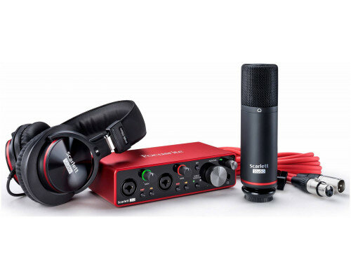 | Дополнительная информация | в комплекте: аудиоинтерфейс Scarlett 2I2 (3-го поколения); конденсаторный микрофон Scarlett Studio CM25 MkIII и зажим для микрофона; наушники Scarlett Studio HP60 MkIII; микрофонный кабель Red XLR (3 м); USB кабель «тип A – тип C» |