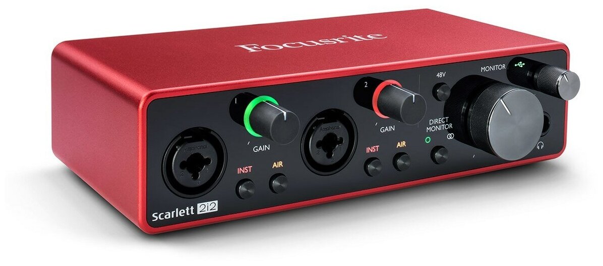 | Дополнительная информация | в комплекте: аудиоинтерфейс Scarlett 2I2 (3-го поколения); конденсаторный микрофон Scarlett Studio CM25 MkIII и зажим для микрофона; наушники Scarlett Studio HP60 MkIII; микрофонный кабель Red XLR (3 м); USB кабель «тип A – тип C» |