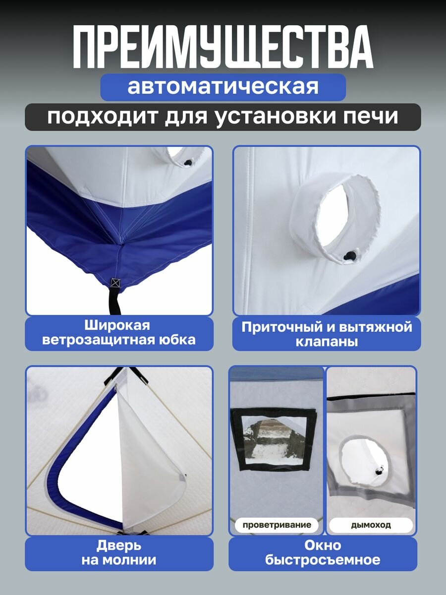 Палатка зимняя быстросборная Следопыт PF-TW-08 бело-синяя трехслойная, трехместная, 195 х 195 х 210 см, 1 вход