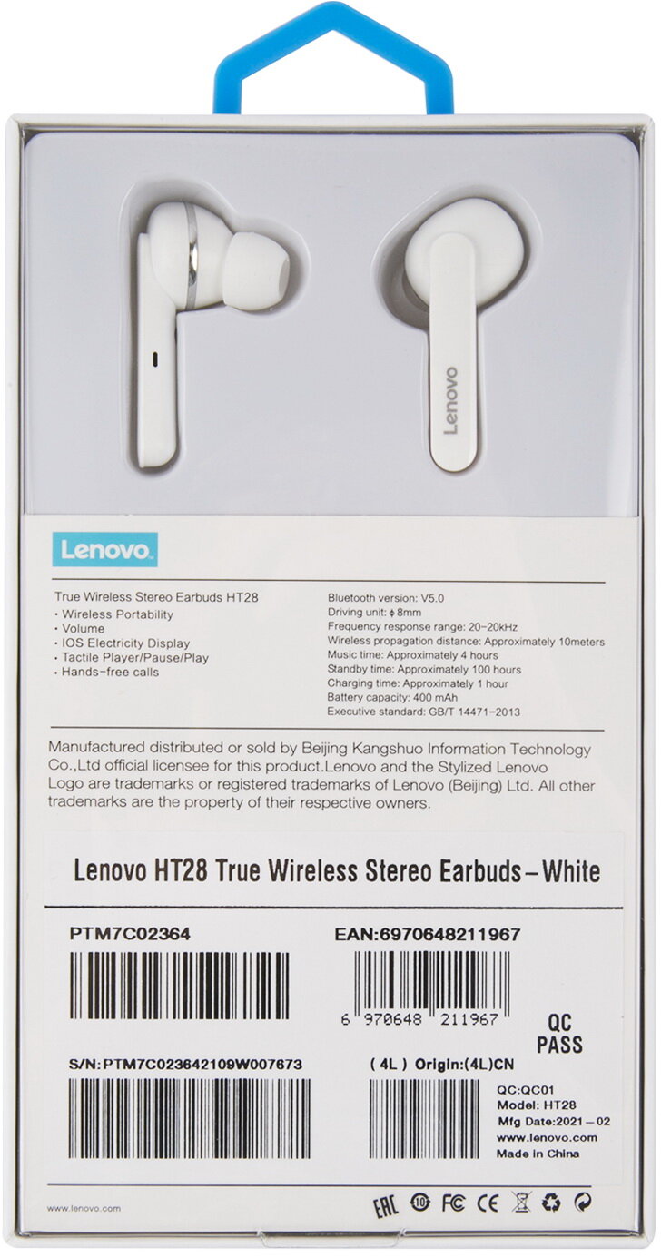 Наушники Lenovo HT28 с микрофоном (TWS), белые