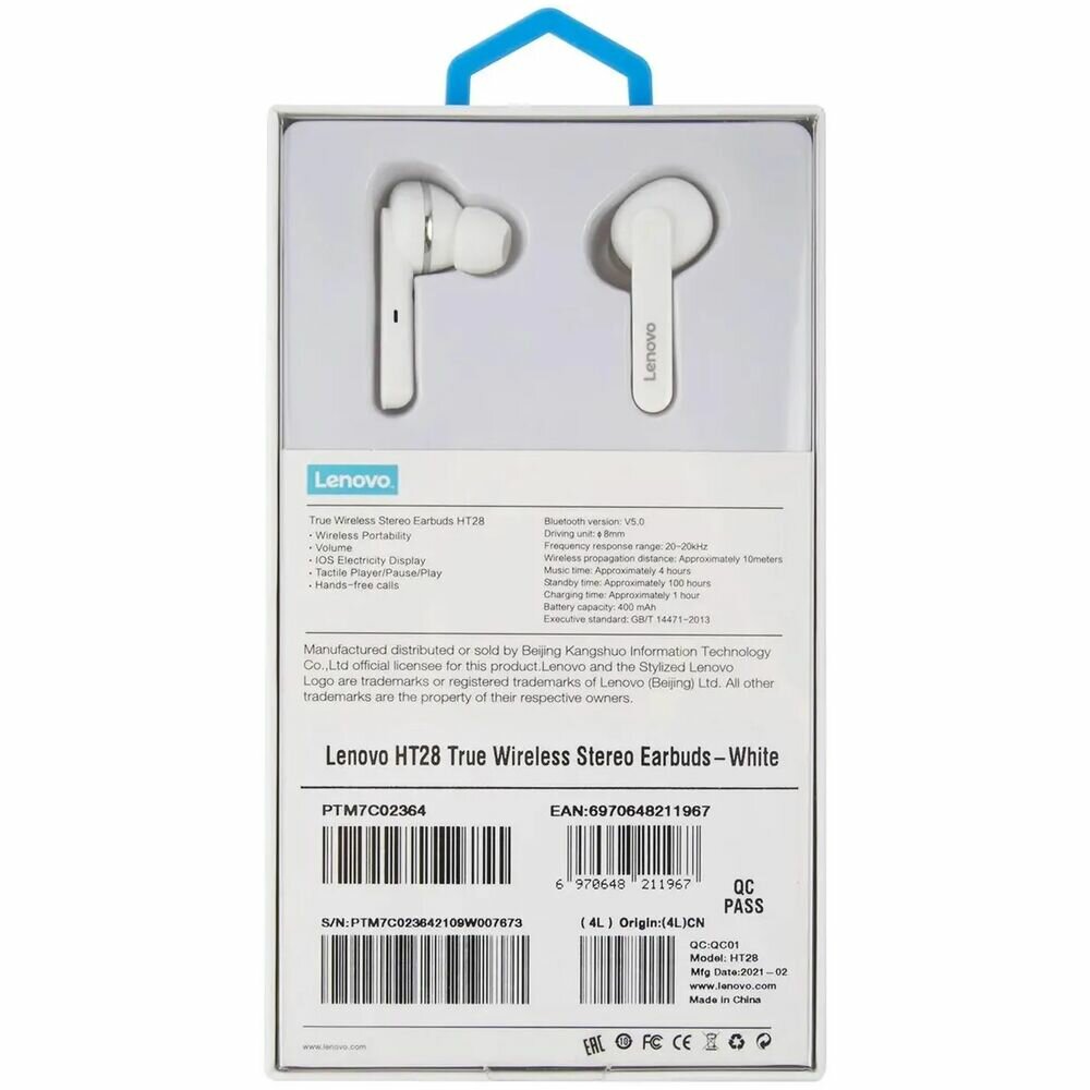 Lenovo Опция для ноутбука TWS Headset HT28 Белые Наушники Bluetooth