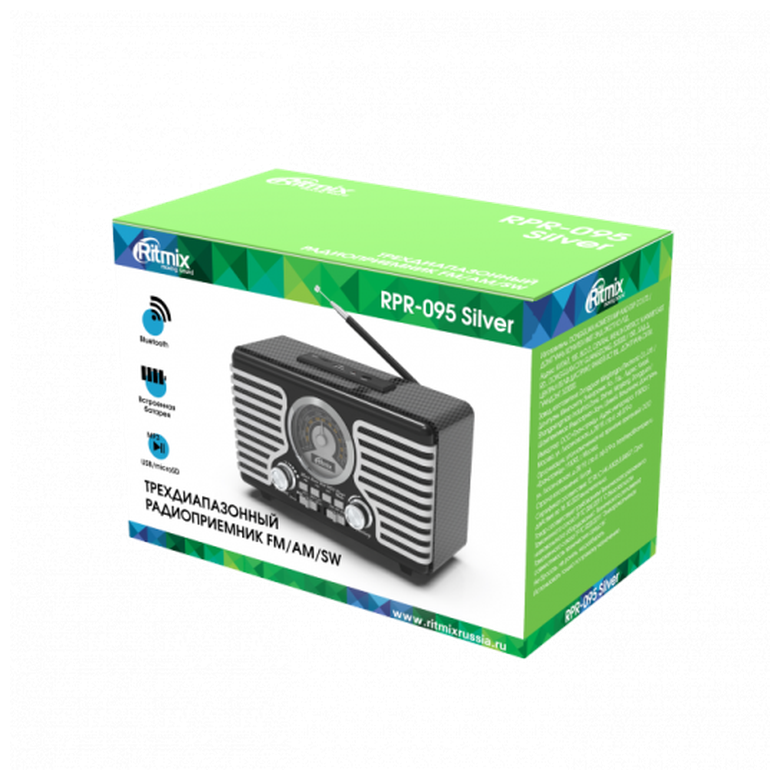 Радиоприёмник RITMIX RPR-095, серебро. Поддержка Bluetooth. Возможность воспроизведения MP3 с USB- и Micro SD-носителей, а также через AUX вход или Bluetooth