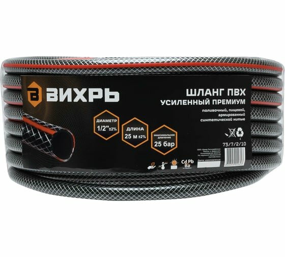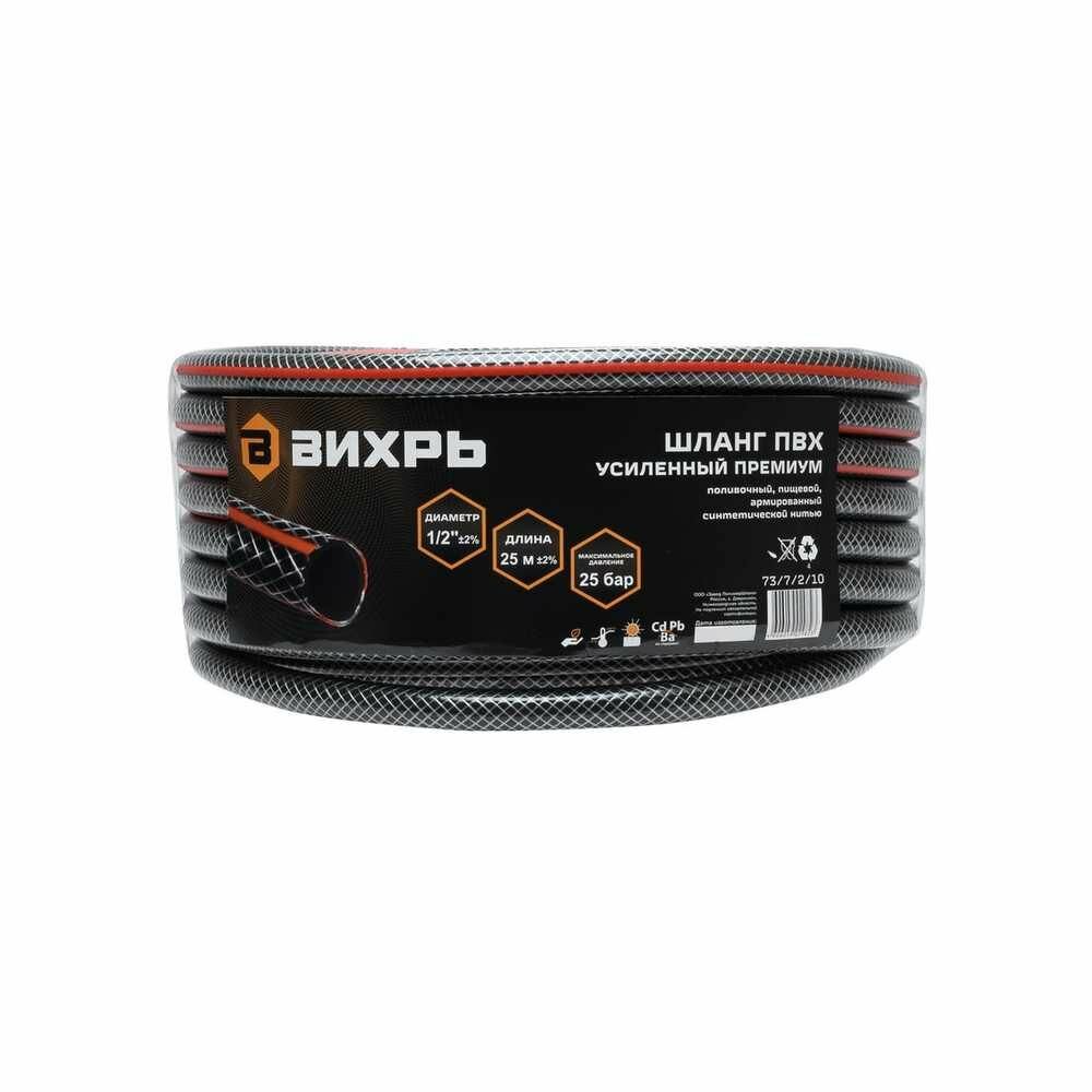 Шланг поливочный Вихрь ПВХ усиленный премиум, пищевой трехслойный армированный 1/2, 25м, 73/7/2/10