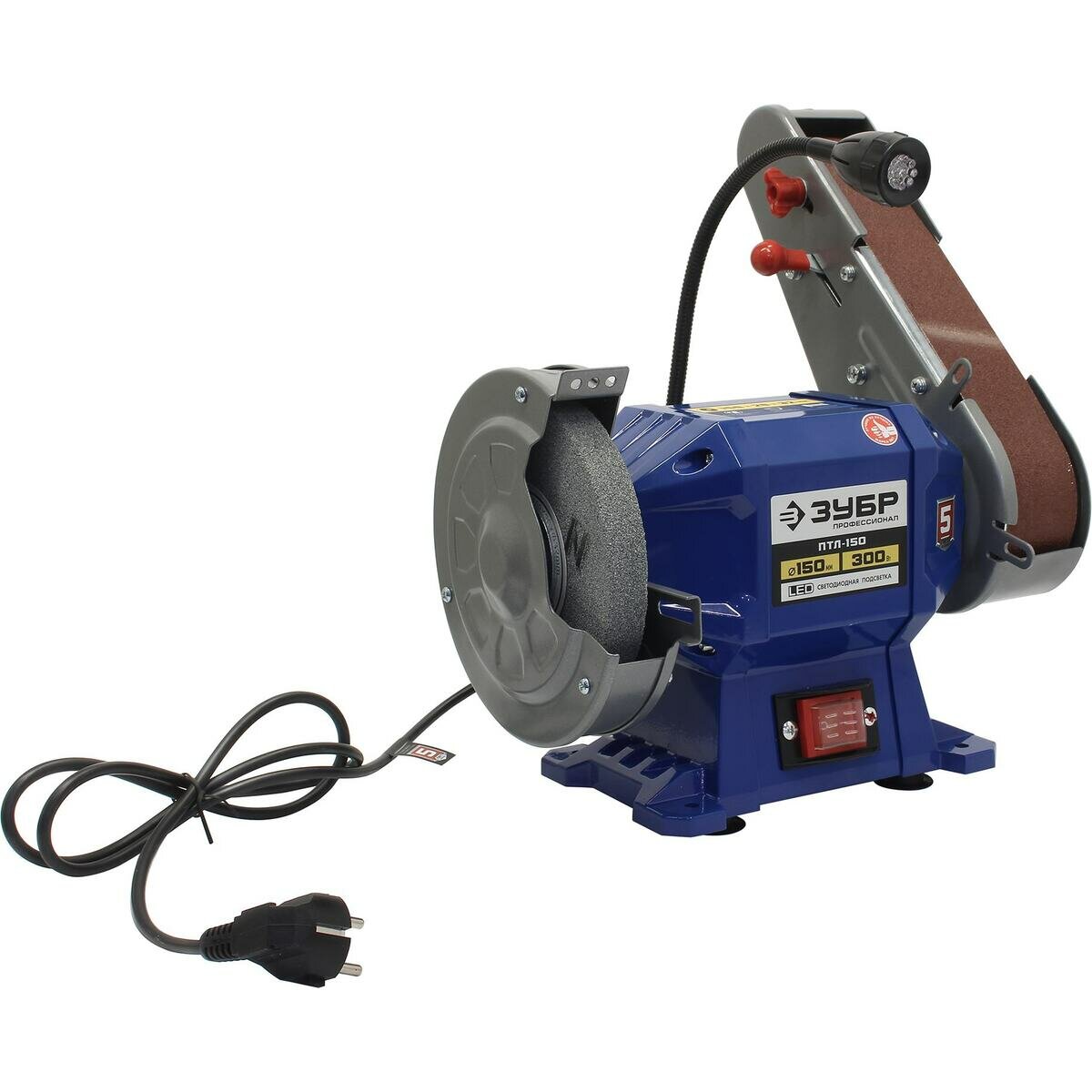 Точильный станок с шлифовальной лентой ЗУБР ПТЛ-150 (300Вт, 2950 об/мин, 1 диск 150мм, лента 50х686мм, подсветка)