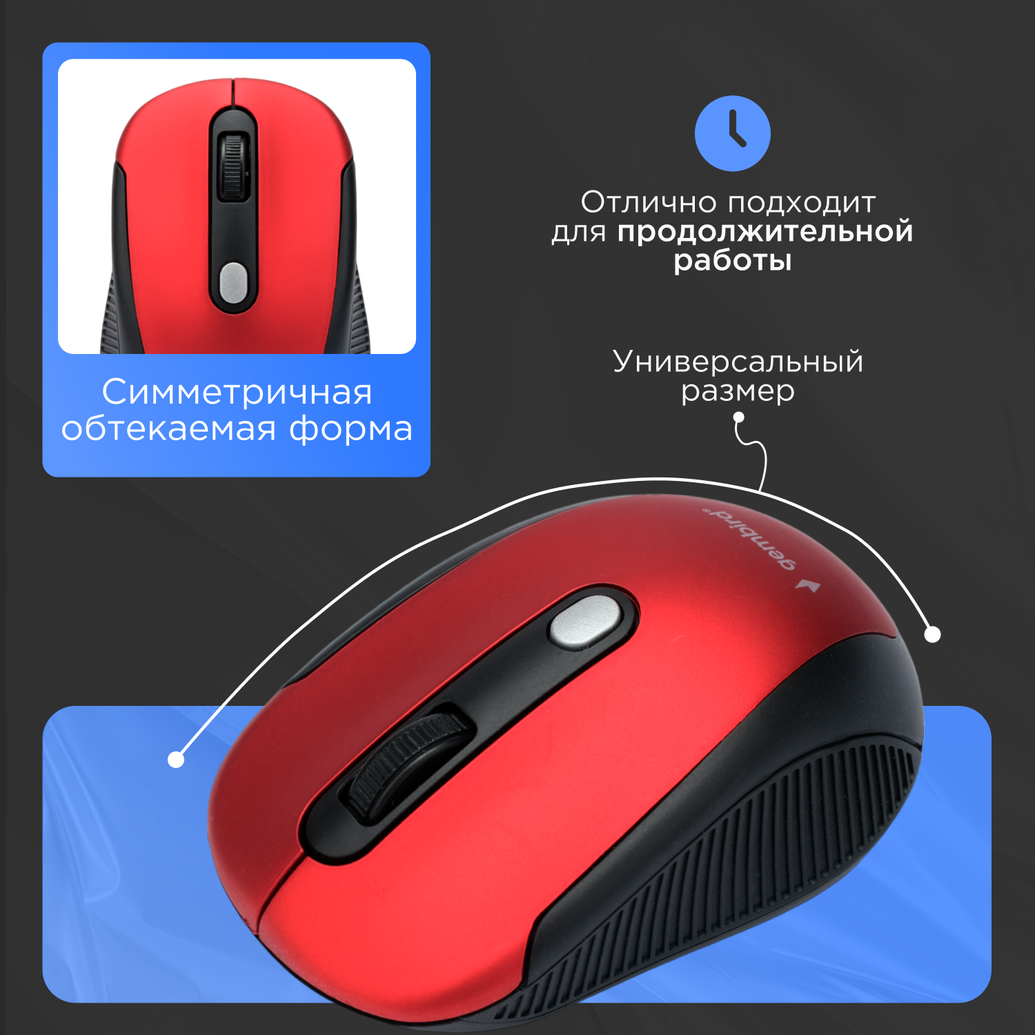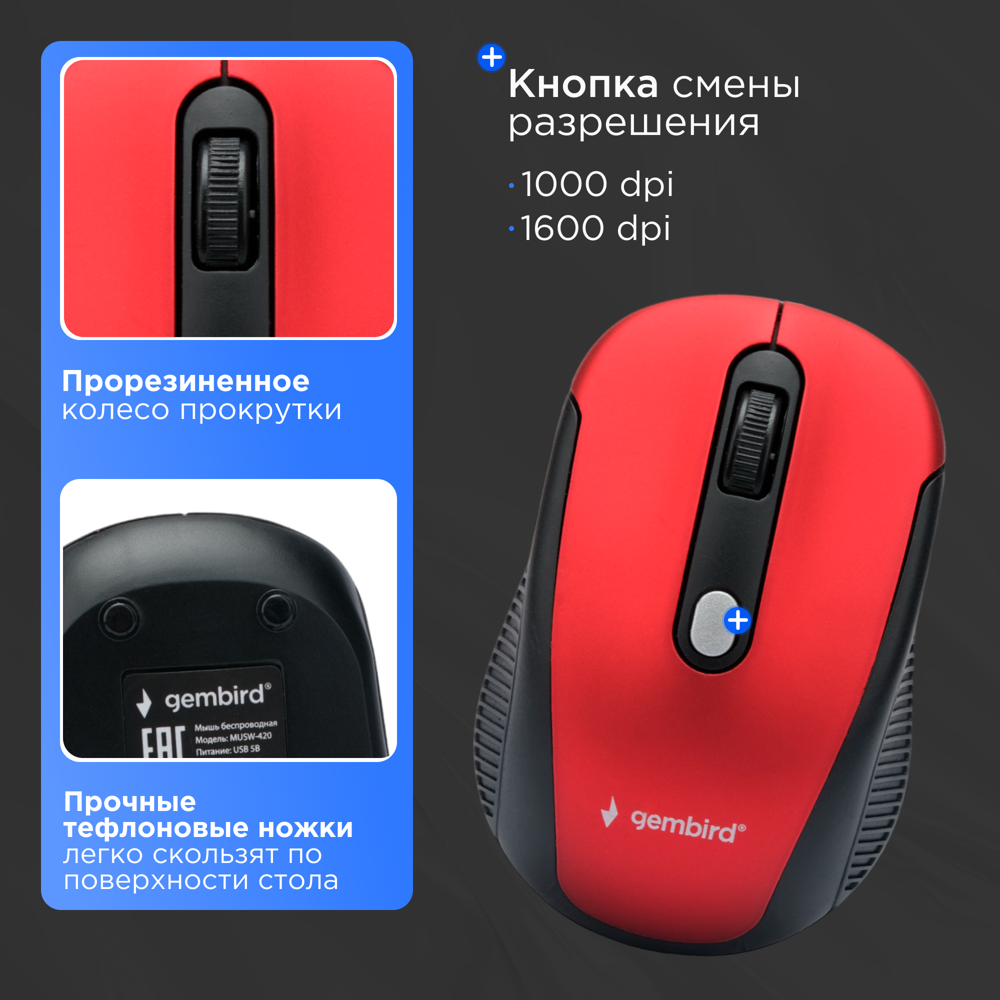 Мышь беспров. Gembird Musw-420-1, 2.4ГГц, красный,4кн, 1600DPI, блистер Gembird MUSW-420-1