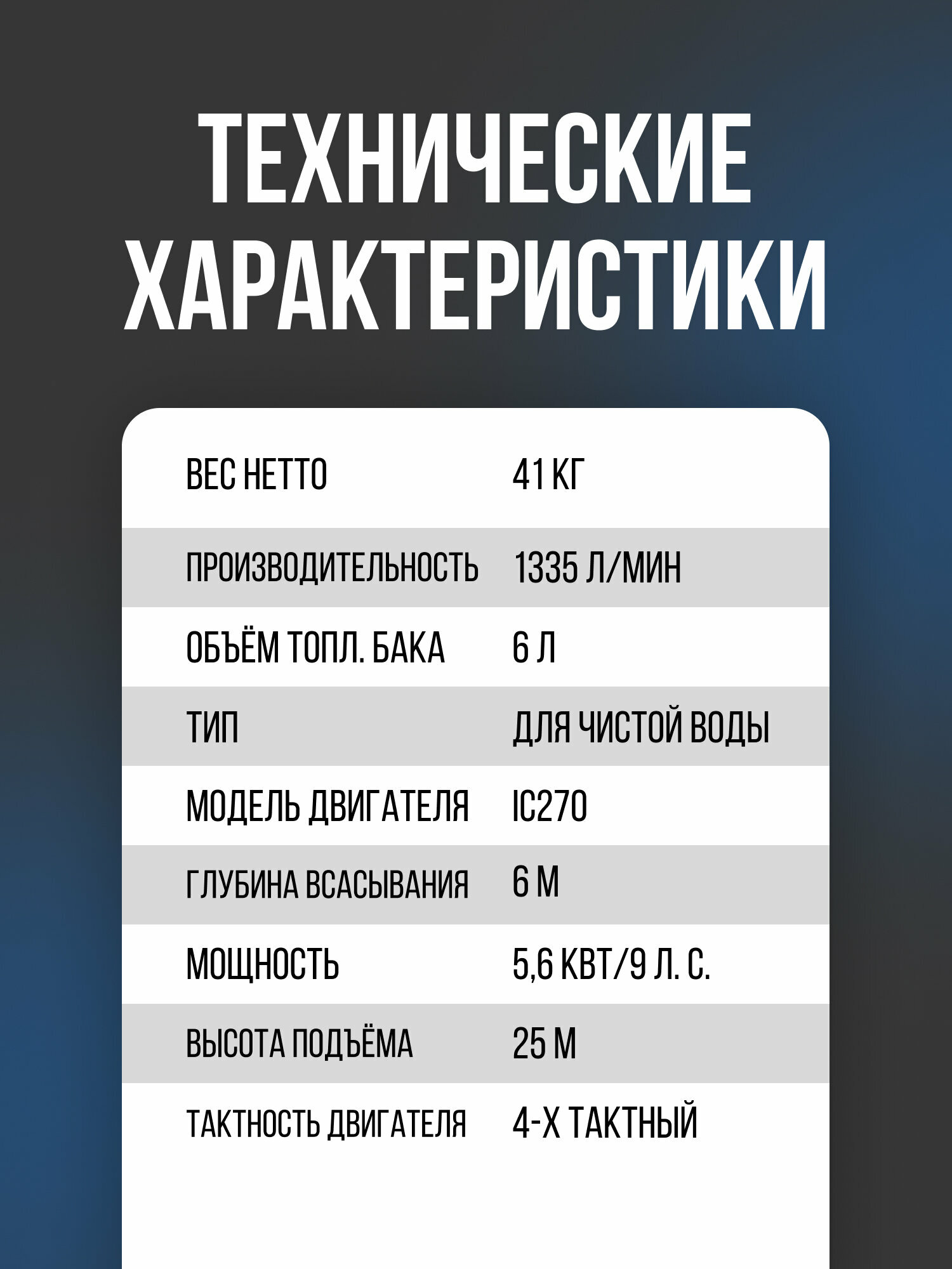 | Комплектация | мотопомпа, фильтр, комплект фитингов для шланга, инструкция по эксплуатации, упаковка |