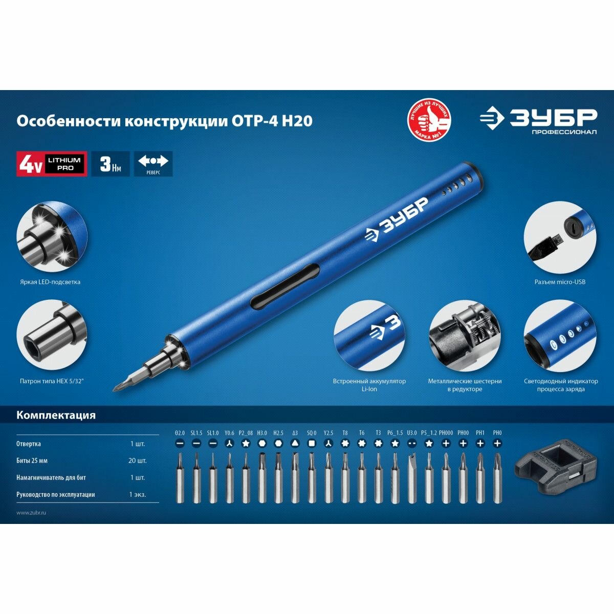 ЗУБР Профессионал ОТР-4 Н20 отвертка аккумуляторная 4 Vmax для точных работ с набором 20 бит