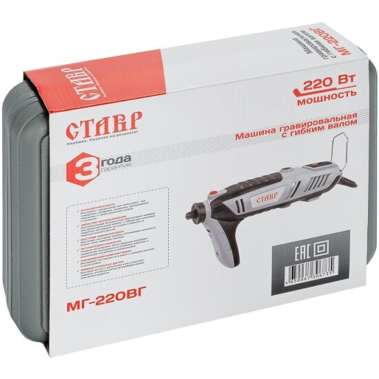 Ставр МГ-220ВГ Машина гравировальная с гибким валом 220 Вт, 10 000-40 000об/мин, цанговый патрон 2-3,2мм, гибкий вал, комплект насадок, опорная штанга, кейс ,длина сетевого кабеля 2м