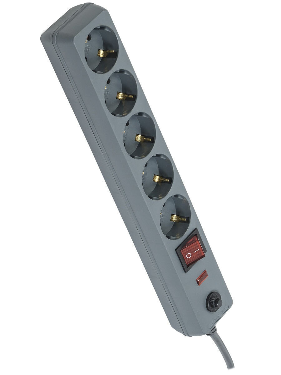 Сетевой фильтр IEK СФ-05К-выкл, 3,5 кВт, 16 А, с заземлением, с кнопкой, 5 розеток, 5 м, серый