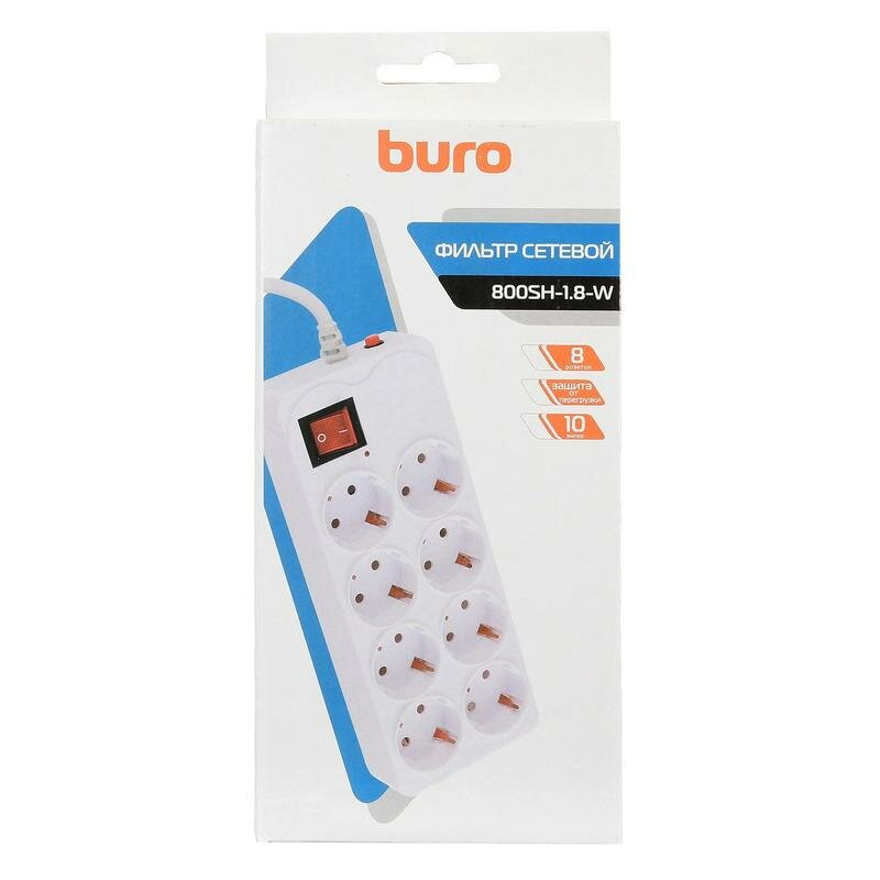 Сетевой фильтр Buro 800SH-1.8-W 1.8м, 8 розеток, белый (коробка)