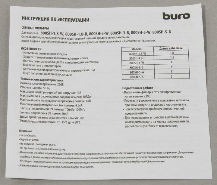 Сетевой фильтр Buro 800SH-1.8-B