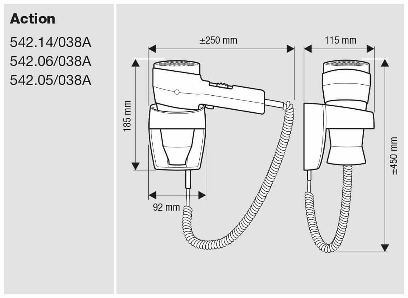 Фен настенный Valera Hospitality Action Protect 1600 (542.06/044.04 white), мощность 1600 Вт, безопасная кнопка включения/выключения, настенный держатель c устройством защитного отключения, холодный воздух, концентратор, спиральный сетевой кабель