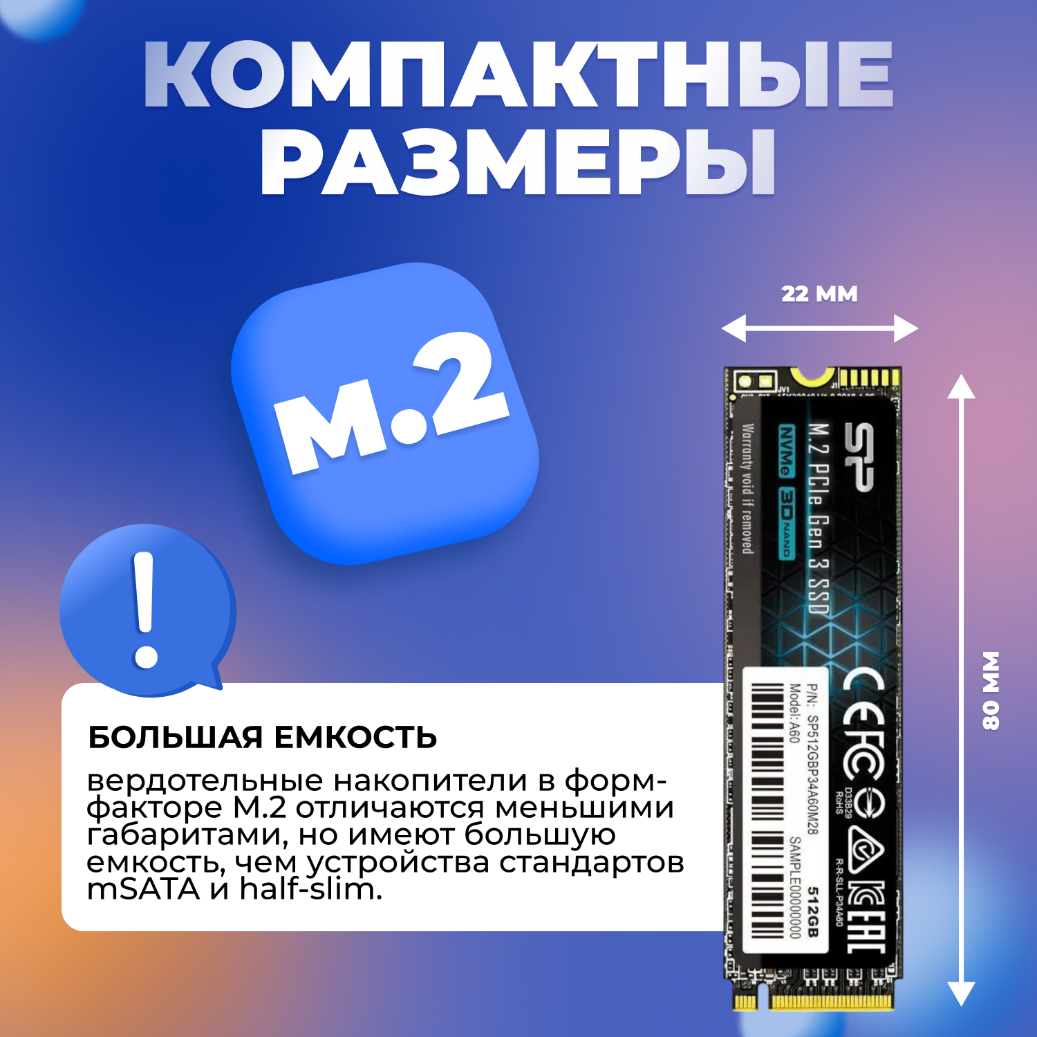 Накопитель SSD Silicon Power SP512GBP34A60M28 P34A60 /PCI-E 3.0 x4/512GB /Скорость чтения 2200МБайт/с Скорость записи 1600МБайт/с