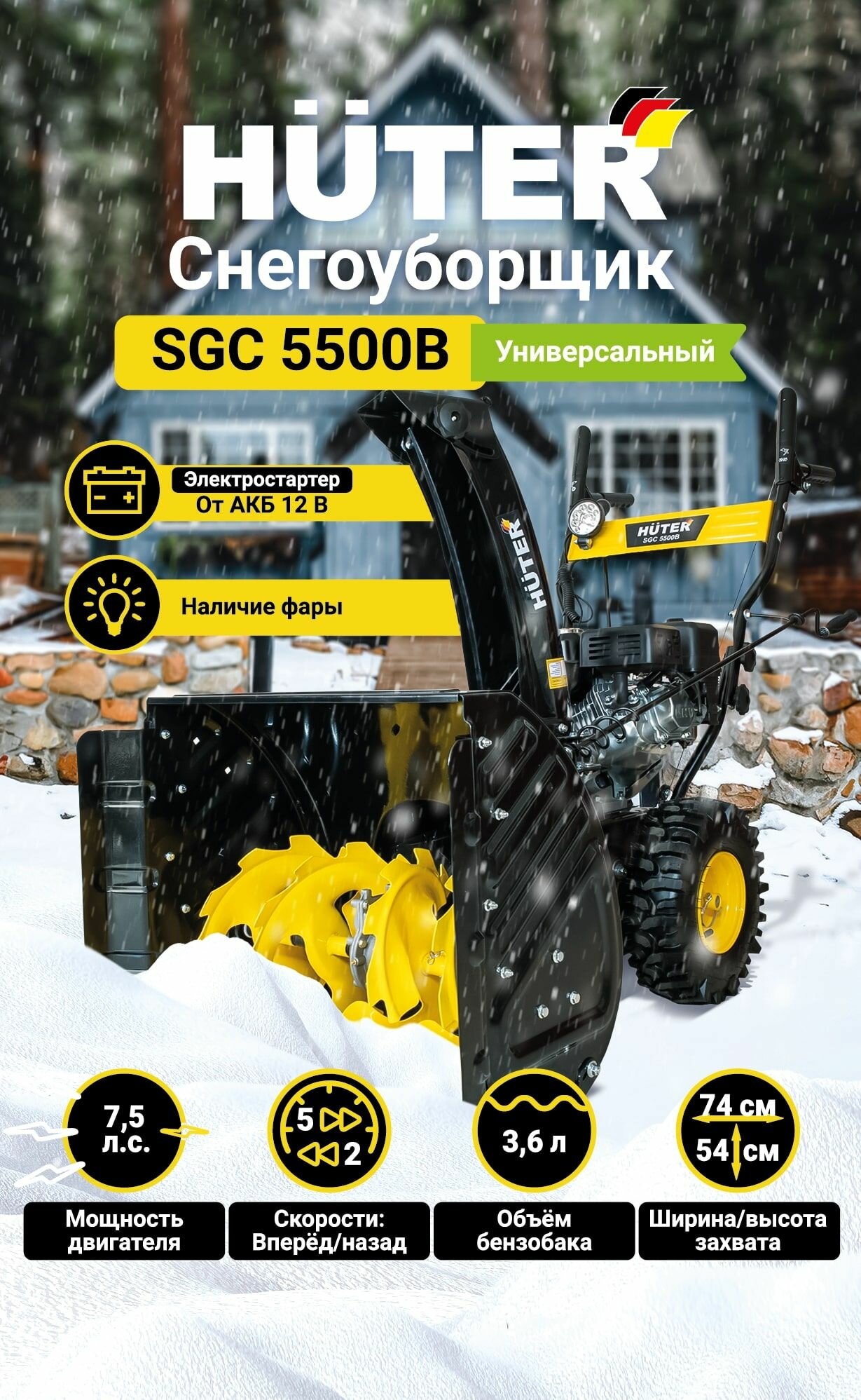 Снегоуборщик Huter SGC-5500В, 7,5 л.с., ковш 74х54см, 5 вперед / 2 назад