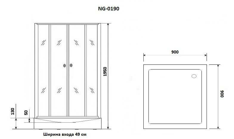 Душевой уголок NG- 0190-14 (900х900х1950) низкий поддон(14см), стекло прозрачное, 2 места