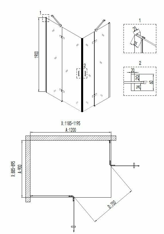 Душевое ограждение NG- 6618-08 (120*90*190) прямоугольное, двери распашные, 1 место