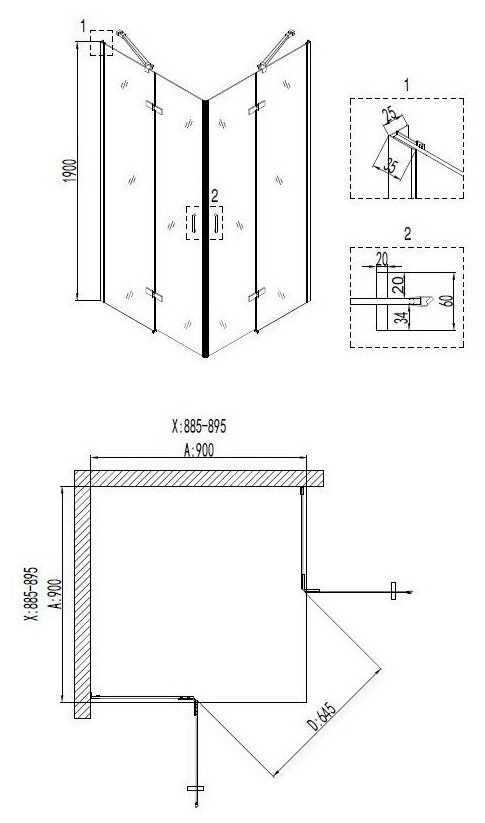 Душевое ограждение NG- 6613-08 (90*90*190) квадрат, двери распашные, 1 место