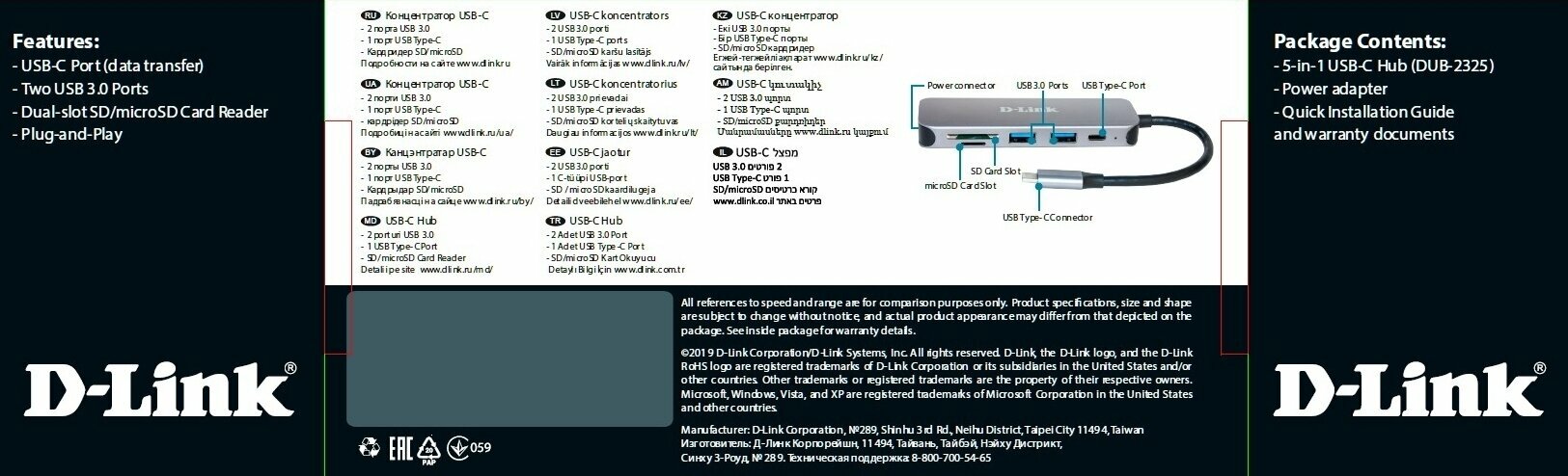 Концентратор usb D-Link DUB-2325/A1A, 2-port USB 3.0, USB Type-C port, SD and microSD card slots Hub.2 downstream USB type A (female) ports, 1 downstream USB type C (female) port, 1 upstream USB type C (male), 1 SD