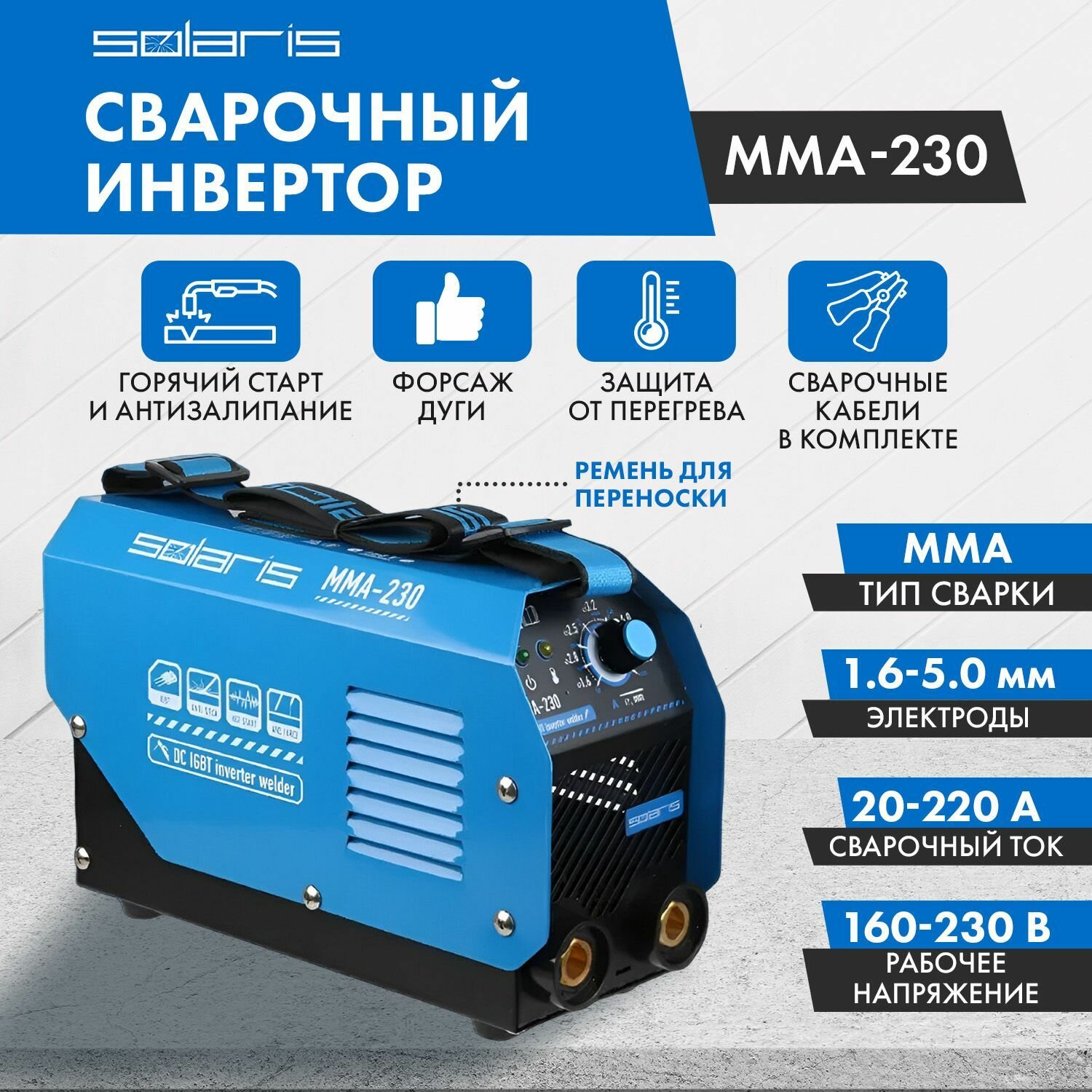Инвертор сварочный SOLARIS MMA-230 (230В; 20-230 А; 69В; электроды диам. 1.6-5.0 мм; вес 3.7 кг)