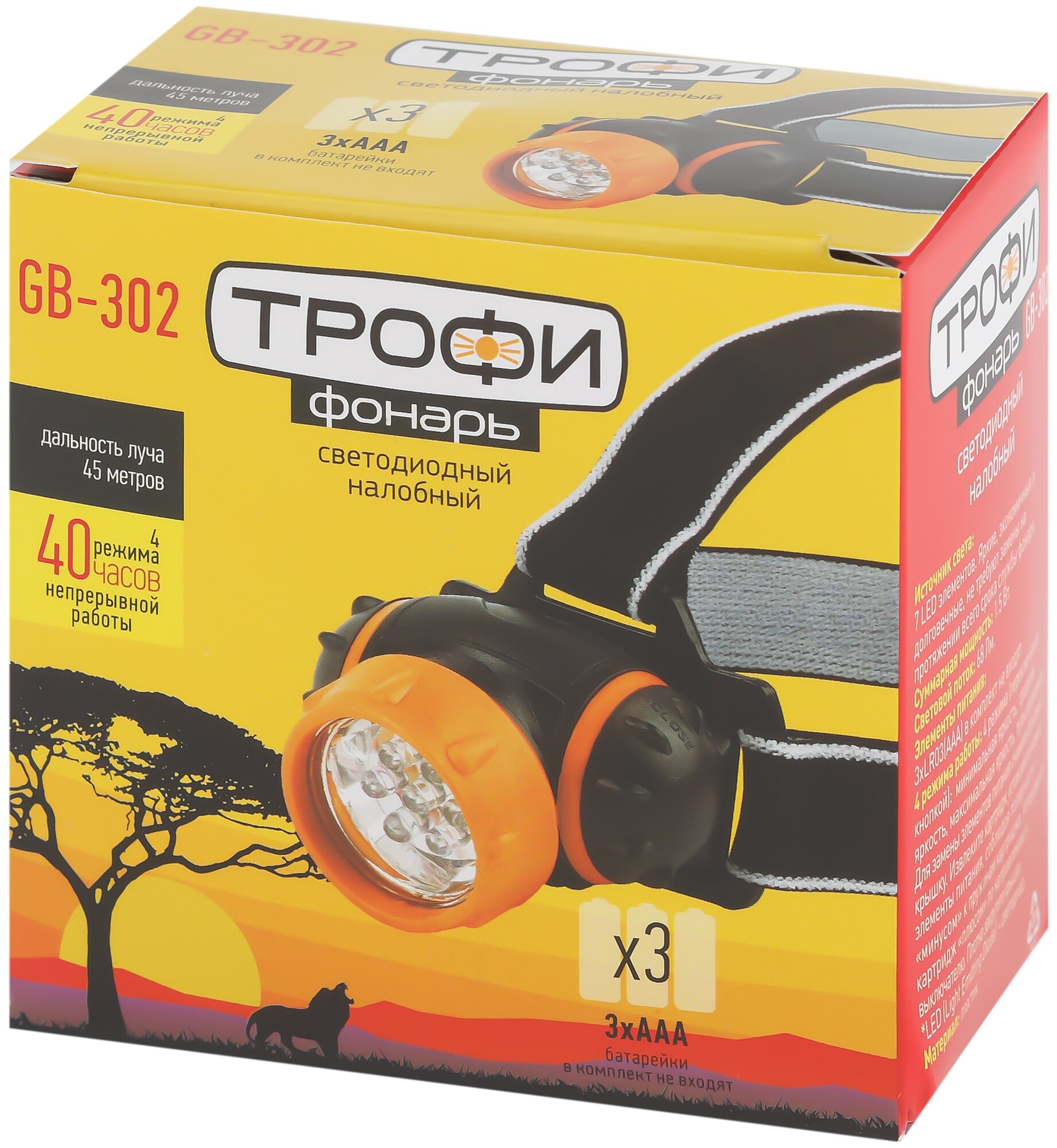 Фонарь налобный трофи GB-302 7xLED, 3хААА, картон