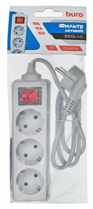 Сетевой фильтр Buro 300SL-1-G 1м (3 розетки) серый (пакет ПЭ)