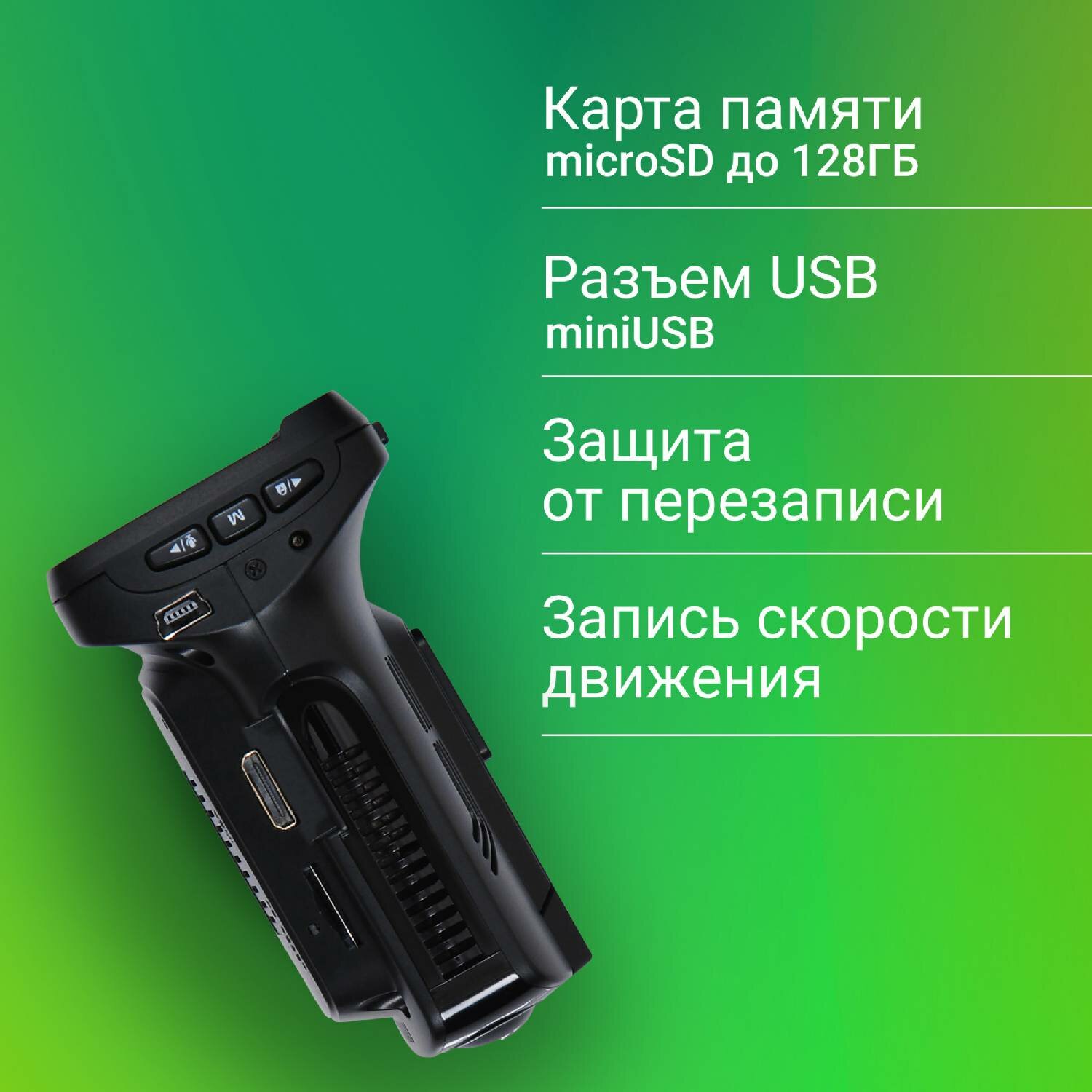 б) Оснащен радар-детектором; в) Циклическая запись, простота настройки. |