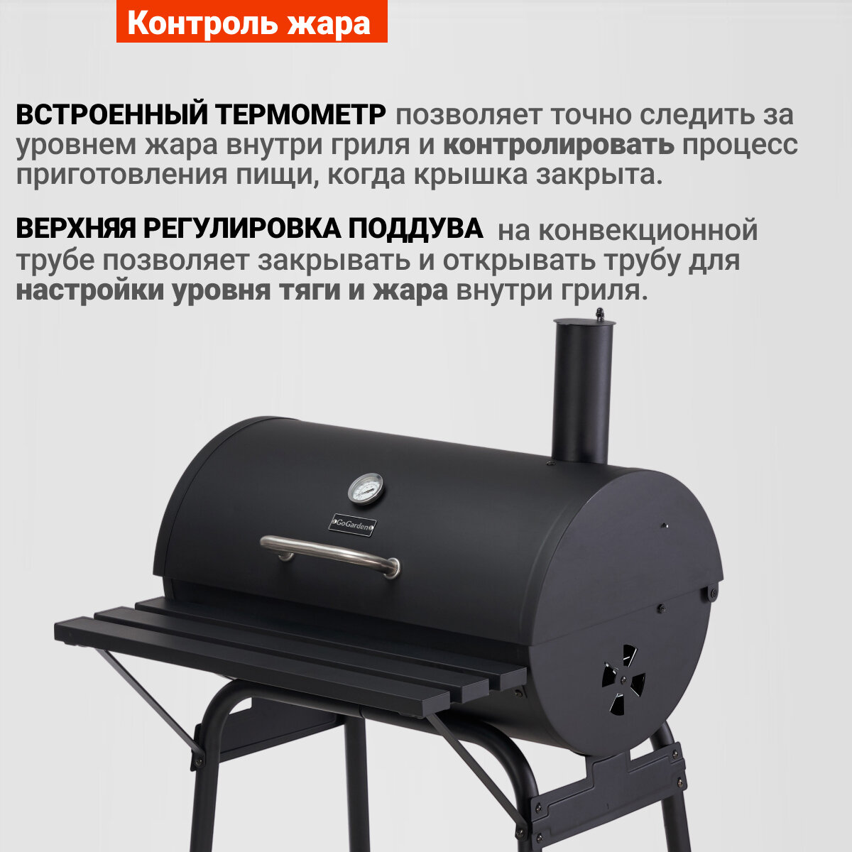 GOGARDEN CHEF-Master 66 гриль "бочка" стационарный с термометром и регулировкой высоты решетки черны