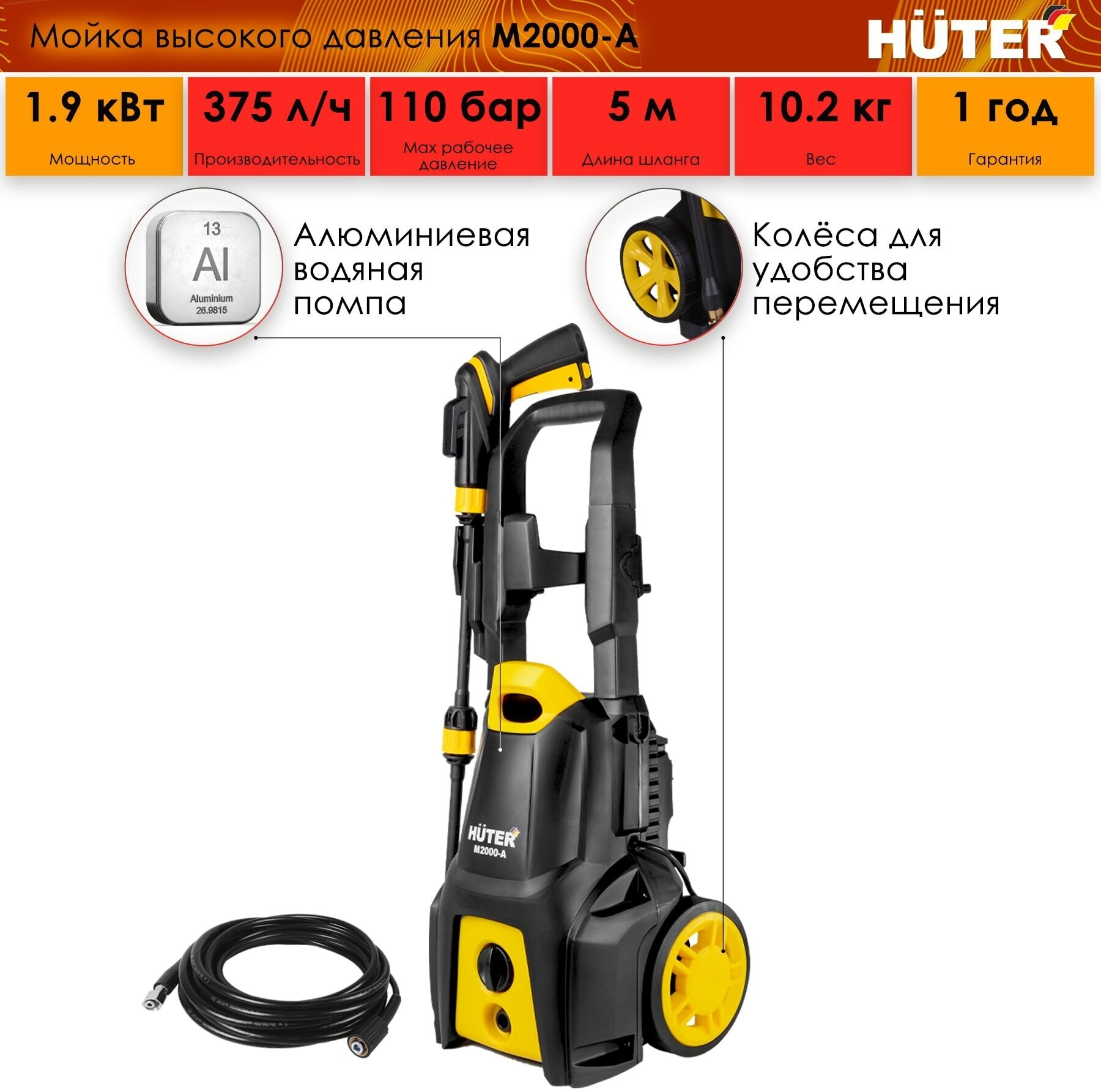 Мойка высокого давления Huter M2000-A, 1900 Вт, 165 Бар, 375 л/ч, шланг – 5 м, подача воды: водопровод/емкость