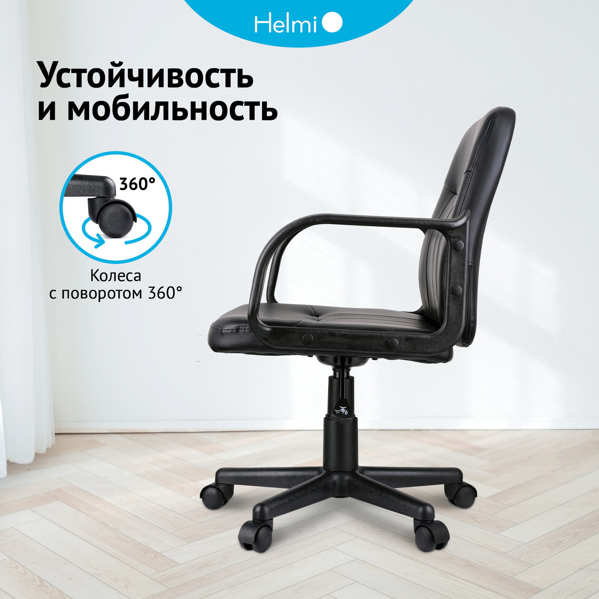 Компьютерное кресло Helmi HL-M01 "Brief"/Сиденье и спинка из черной экокожи, с подлокотниками, на колесиках, с регулировкой по высоте /Офисный компьютерный стул, мебель для дома