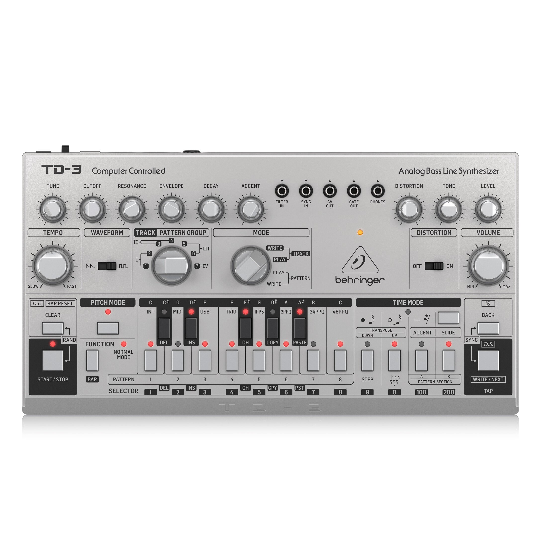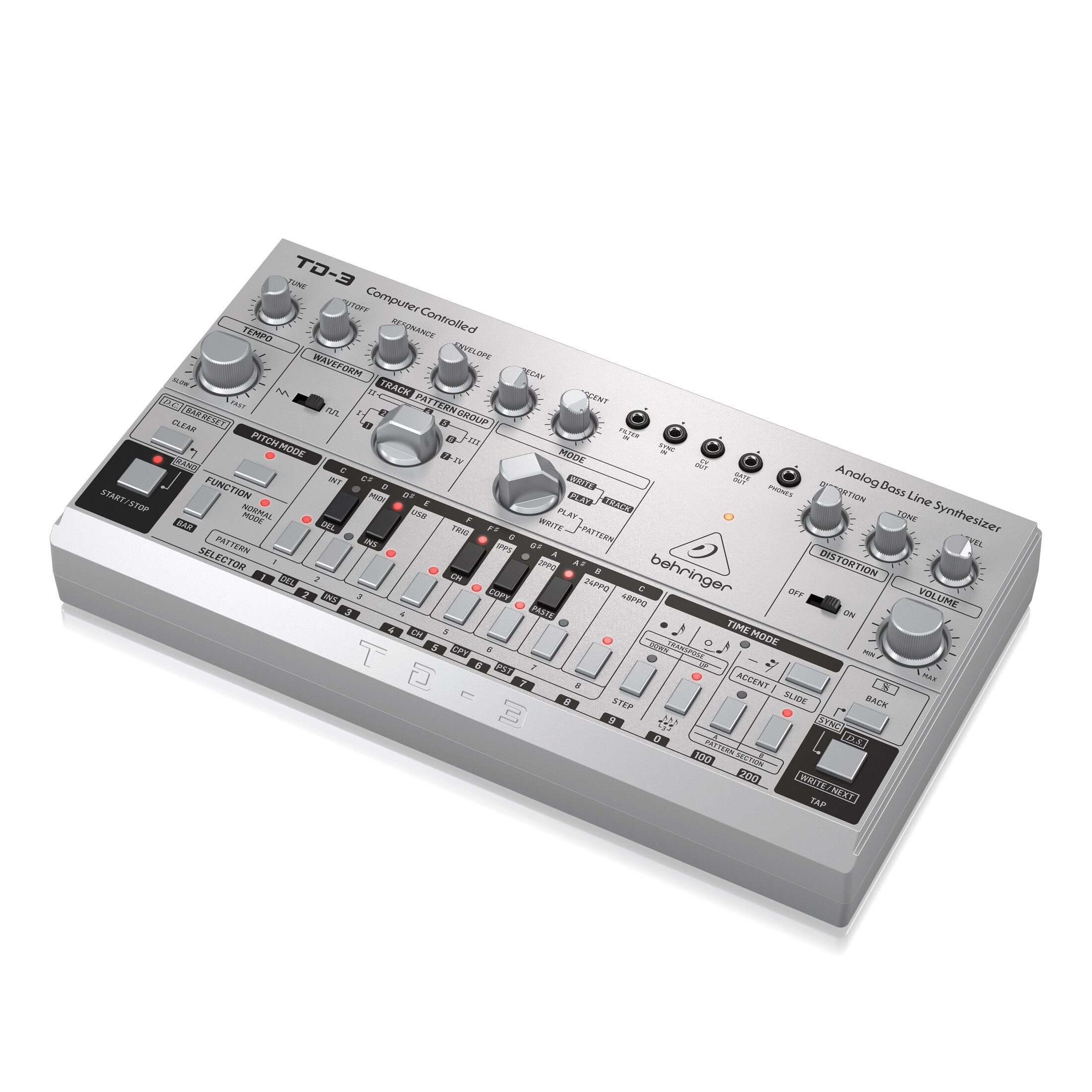 Купить Behringer TD-3-SR басовый синтезатор, встроенный дисторшн, VCO, VCF, VCA, 16-шаговый секвенсор, 16 голосов. Серебристый