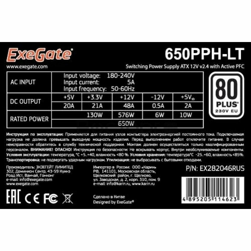 Блок питания ExeGate 650PPH-LT 650 Вт [80+ Bronze, ATX vATX 12V 2.4,APFC,120 x 120][EX282046RUS-OEM]