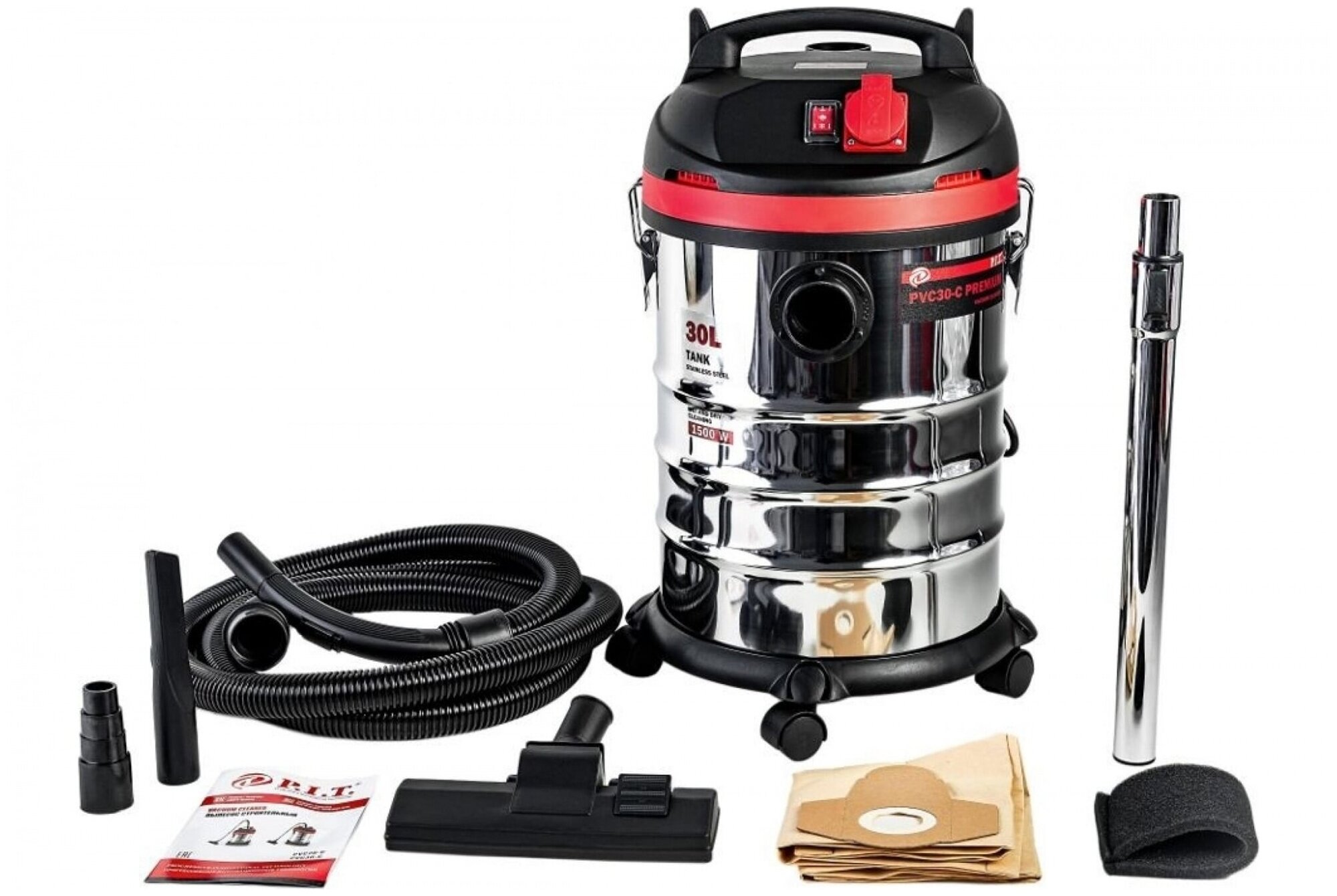 Пылесос PVC30-C мастер 1,5кВт,3 м шланг,пыль.сбор 30л,нерж.к-с,бум.мешок, 2кВт подключаемый инст) P.I.T