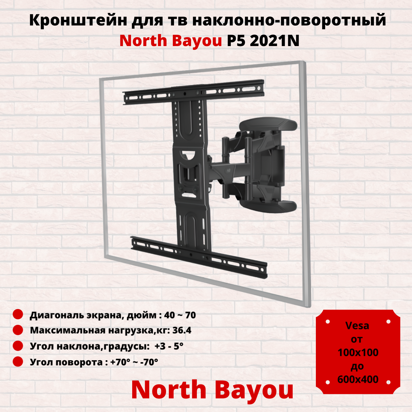 Кронштейн для телевизора наклонно-поворотный на стену диагональ 40"-70" North Bayou NB P5 2021 New,черный