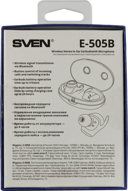 Купить Гарнитура Sven E-505B, Bluetooth, внутриканальные, черный [sv-019259]