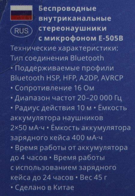 Беспроводные внутриканальные наушники с микрофоном E-505B, черный (Bluetooth, TWS)