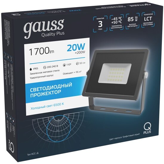 Прожектор светодиодный Qplus 20Вт 6500К 1700лм IP65 графит. сер. 1/20 Gauss GAUSS 690511320 (1 шт.)