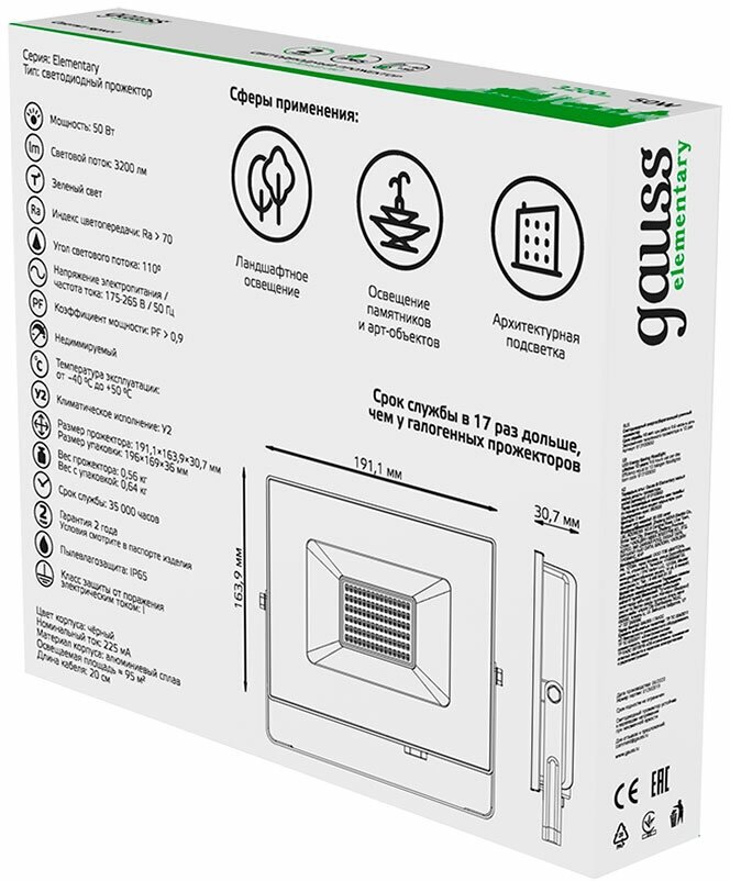 СохранитьПрожектор Gauss Elementary 50W 3200lm зеленого свечения 175-265V IP65 черный LED интересное: